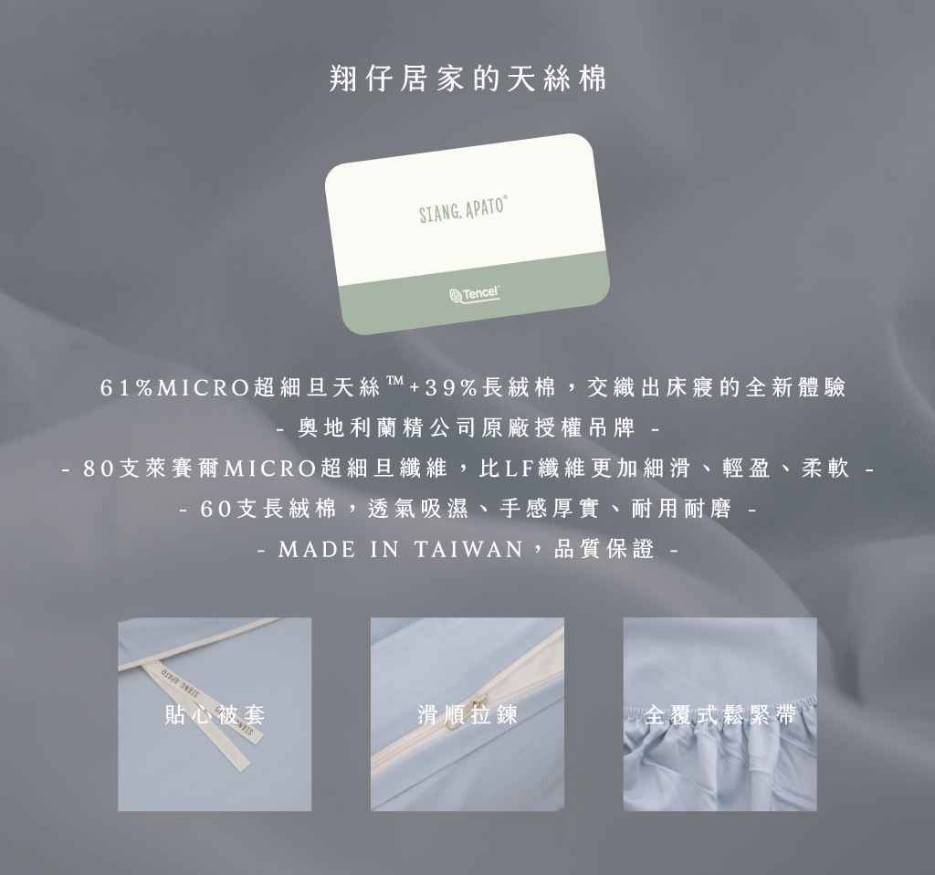 天絲棉兼具天絲和棉花的優點,具有天絲的光澤滑順、涼爽抗菌,也擁有棉花特有厚實手感、紮實耐用與冬暖夏涼,且比起純天絲,更加不易起毛球。此外,翔仔居家天絲棉採用80支紗,觸感也較60支天絲更加細緻滑順喔!