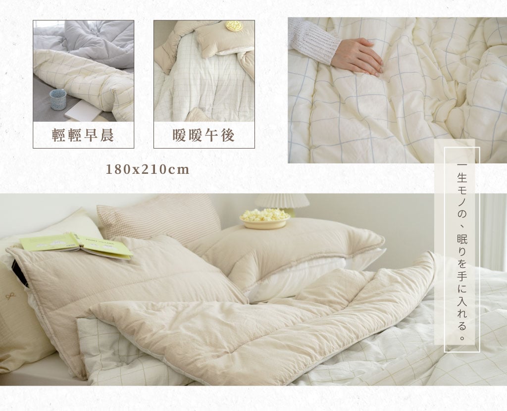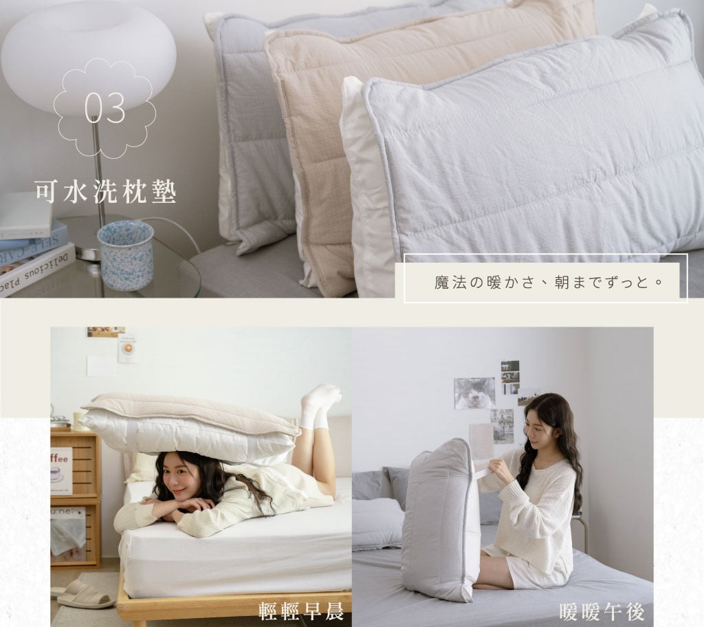 可水洗也可機洗(麻糬被若機洗,洗衣機容量需大於15L),建議搭配洗衣袋及中性清潔劑洗滌,並採自然晾乾,勿讓陽光直射或使用高溫烘乾,以免纖維受到破壞變形。
