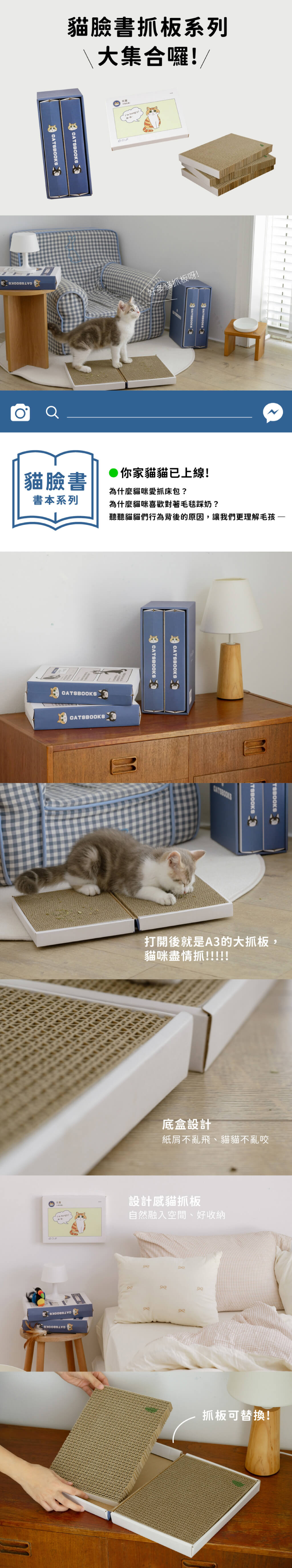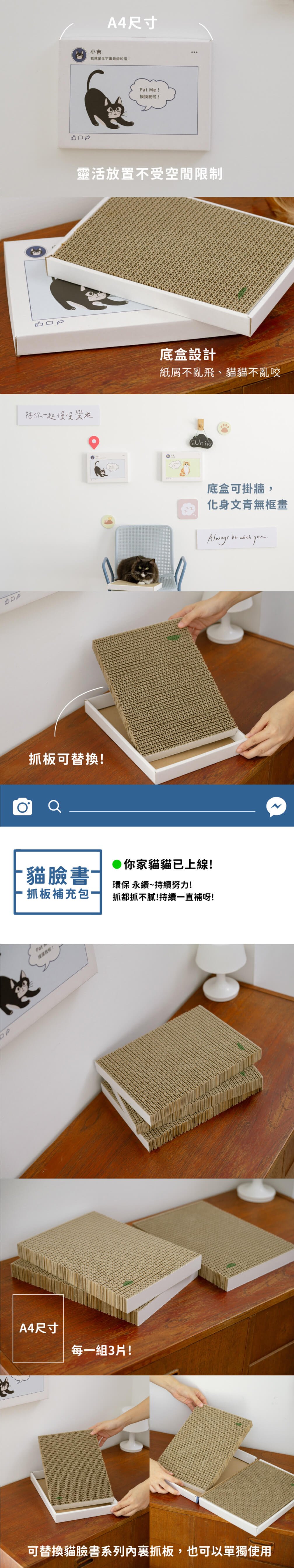 單片尺寸為A4尺寸,方便小坪數空間及各種小空間廣灑使用(書桌下、牆邊、角落等),如果覺得不夠大,也可以參考貓臉書-書本抓板,攤開後會變成A3尺寸喔!