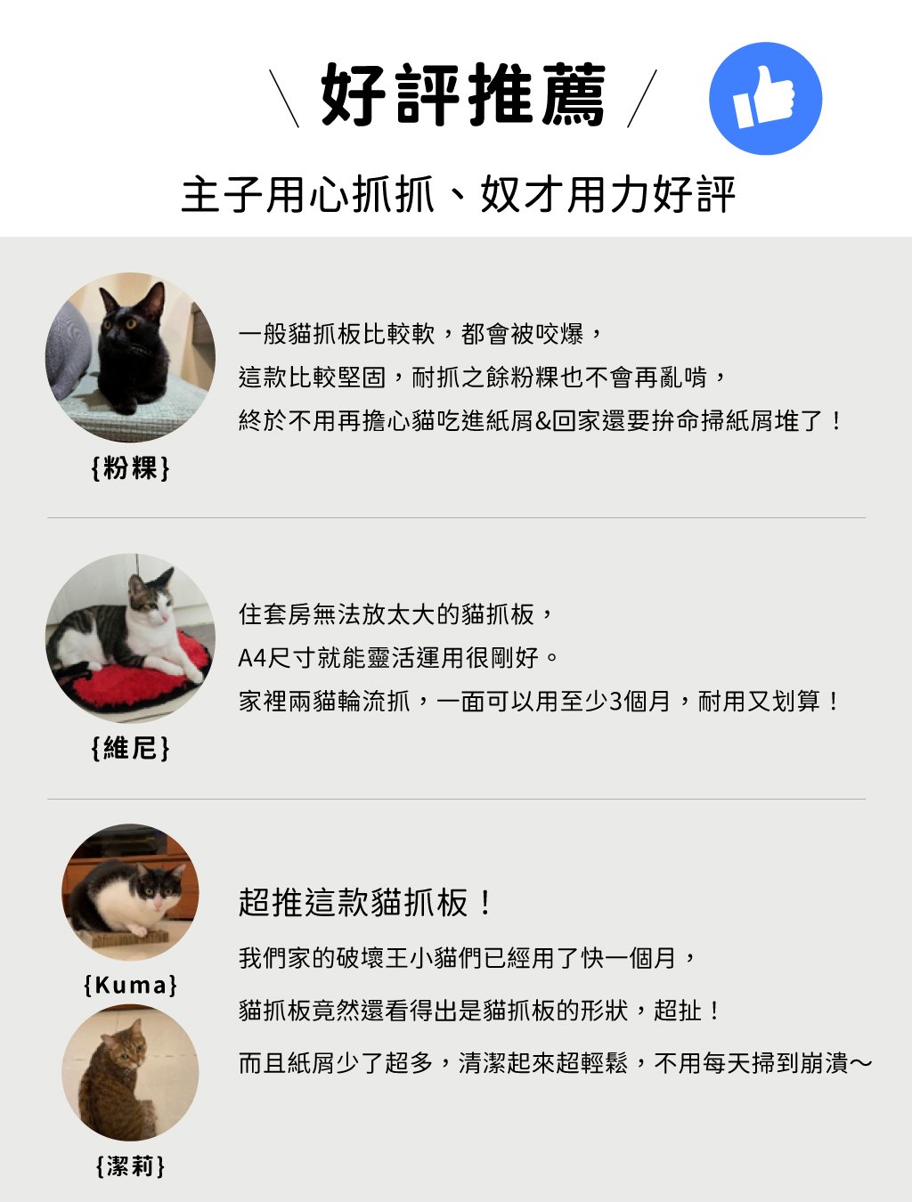 台灣製+PAW-TEX專利的貓抓板擁有堅固耐用、不易掉屑等優點,平均一面可讓一隻貓使用3-4個月,一片(2面)可使用6-8個月喔!