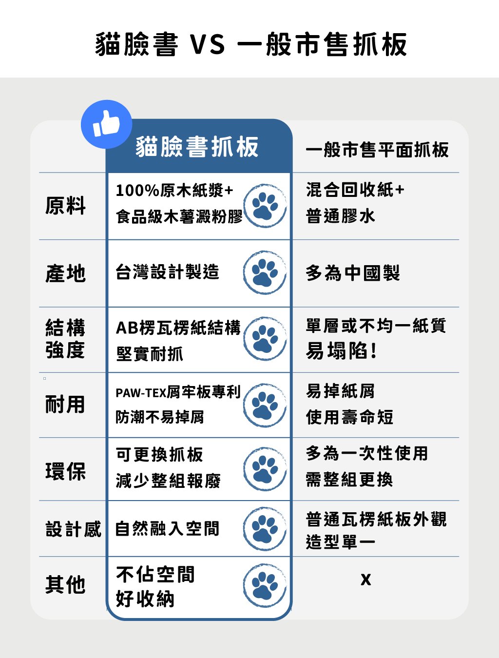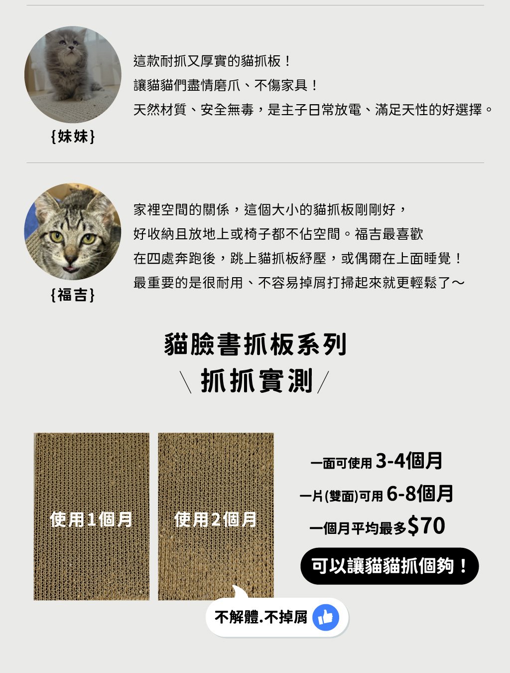 雖然市面上有許多便宜抓板,但是產地、原料、製程與耐用性都有很大的落差(相信大家多少都用過沒幾天就崩毀的抓板吧?),貓臉書系列抓板換算下來平均一天只要$70,就能換得主子爽抓+奴才遠離打掃地獄,其實一點都不貴喔!