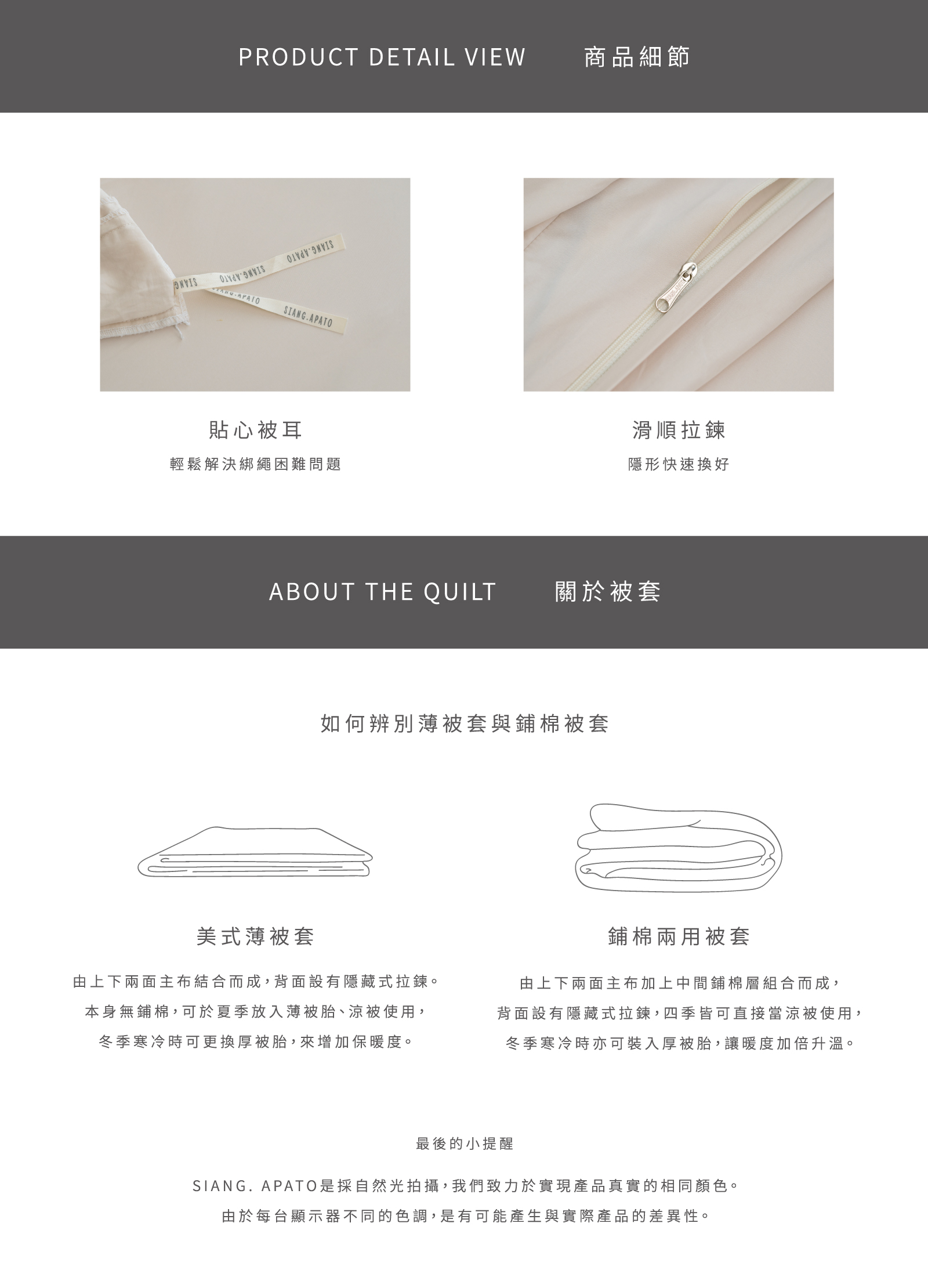 夏日蔚藍 - 天絲棉被套 / Sybil-Ho 聯名款 NT$6,100 NT$ 3,050 可國外配送 可國外配送 「歡迎來到生命力旺盛的小島,海洋清波漾漾,耀眼得無法直視。」 ◆ 61%天絲+39%長絨棉 ,吸濕透氣、手感紮實 ◆ 升級萊賽爾Micro纖維,更加細緻柔滑 ◆ Made in Taiwan 台灣製造,品質安心 NT$6,100 NT$ 3,050 #天絲#棉被#被套#聯名#天絲棉 尺寸 單人雙人 規格 薄被套鋪棉兩用被套 床包尺寸 寬 長 高 公分 床包鋪棉 需要 不需要 被套尺寸 寬 長 公分 被套鋪棉 需要 不需要 價格試算 數量 加入購物車 立即購買 優惠活動 消費滿 990元 即可用優惠價格加購商品 台中購物節合作5倍店家|官網及北屯門市限定! Line詢問 商品細節 尺寸指南 洗滌方式 商品評價(0)