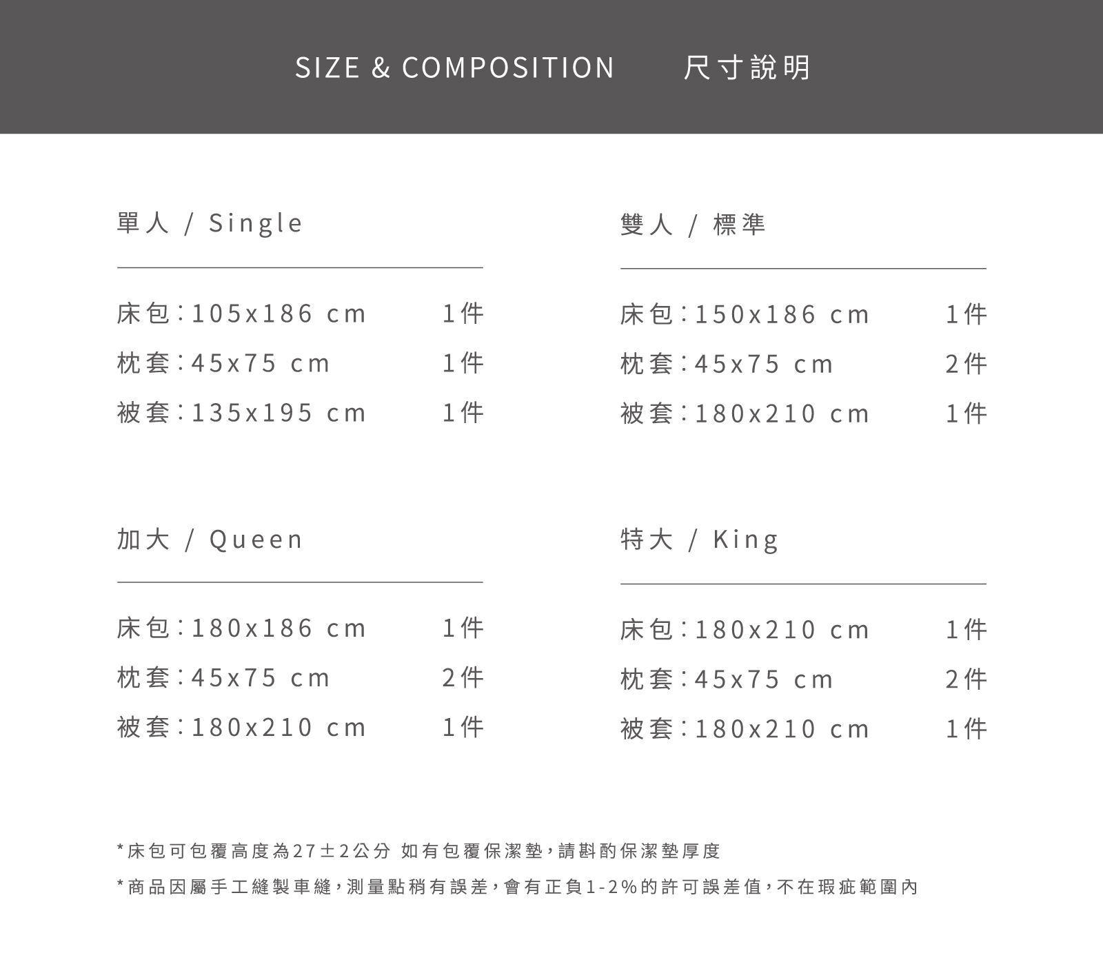 莎夏 - 純棉四件組 ( 床包 + 被套 + 枕套 ) NT$4,260 NT$ 2,130 可國外配送 可國外配送 「那些岩石、樹木與動物,都有自己的名字。」 ◆ 100% Cotton 40支精梳純棉,透氣柔軟 ◆ Made in Taiwan 台灣製造,品質安心 ◆ 被套內裡附被耳,被胎不跑位 NT$4,260 NT$ 2,130 #精梳棉#床包被套組#單人床包#雙人床包#雙人加大床包#雙人特大床包 尺寸 單人雙人加大特大 規格 薄被套床包組鋪棉兩用被套床包組 床包尺寸 寬 長 高 公分 床包鋪棉 需要 不需要 被套尺寸 寬 長 公分 被套鋪棉 需要 不需要 價格試算 數量 商品已下架 組合內容 莎夏 - 純棉床包組 ( 床包 + 枕套 ):單人 x 1莎夏 - 純棉被套:單人-薄被套 x 1 優惠活動 柔暖耐磨|精梳純棉.華爾紗系列9折 消費滿 990元 即可用優惠價格加購商品 翔仔居家感恩回饋全館滿額禮 ( 數量有限,贈完為止 ) Line詢問 商品細節 尺寸指南 洗滌方式 商品評價(10)