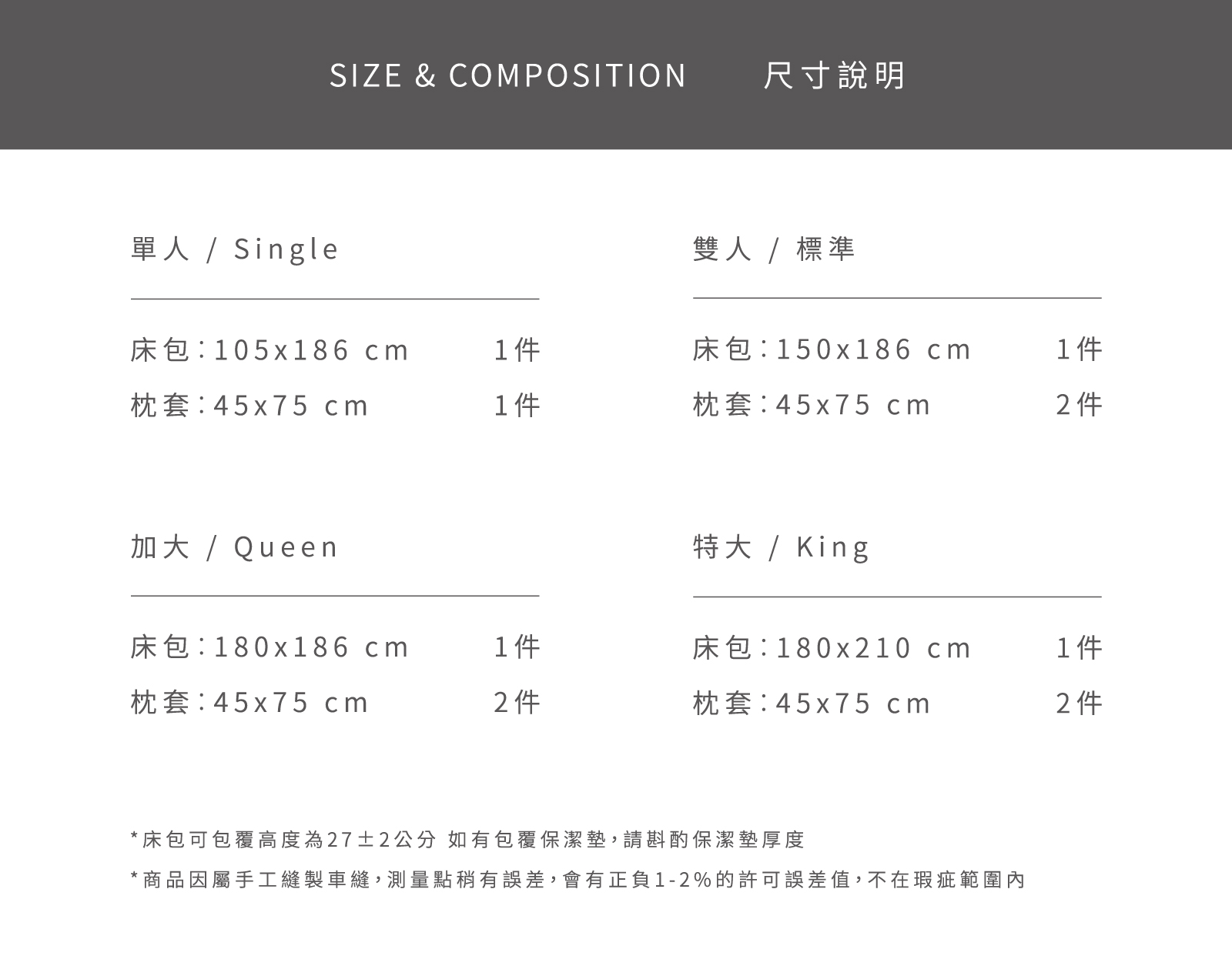 斯奎爾德 - 純棉床包組 ( 床包 + 枕套 ) NT$3,500 NT$ 1,750 可國外配送 可國外配送 「斯奎爾德的黃金比例,柔和的沉穩與恬靜。」 ◆ 100% Cotton 40支精梳純棉,透氣柔軟 ◆ Made in Taiwan 台灣製造,品質安心 ◆ 被套內裡附被耳,被胎不跑位 NT$3,500 NT$ 1,750 #精梳棉#床包組#單人床包#雙人床包#雙人加大床包#雙人特大床包 尺寸 特大 床包尺寸 寬 長 高 公分 床包鋪棉 需要 不需要 被套尺寸 寬 長 公分 被套鋪棉 需要 不需要 價格試算 數量 加入購物車 立即購買 優惠活動 消費滿 990元 即可用優惠價格加購商品 翔仔居家感恩回饋全館滿額禮 Line詢問 商品細節 尺寸指南 洗滌方式 商品評價(10)