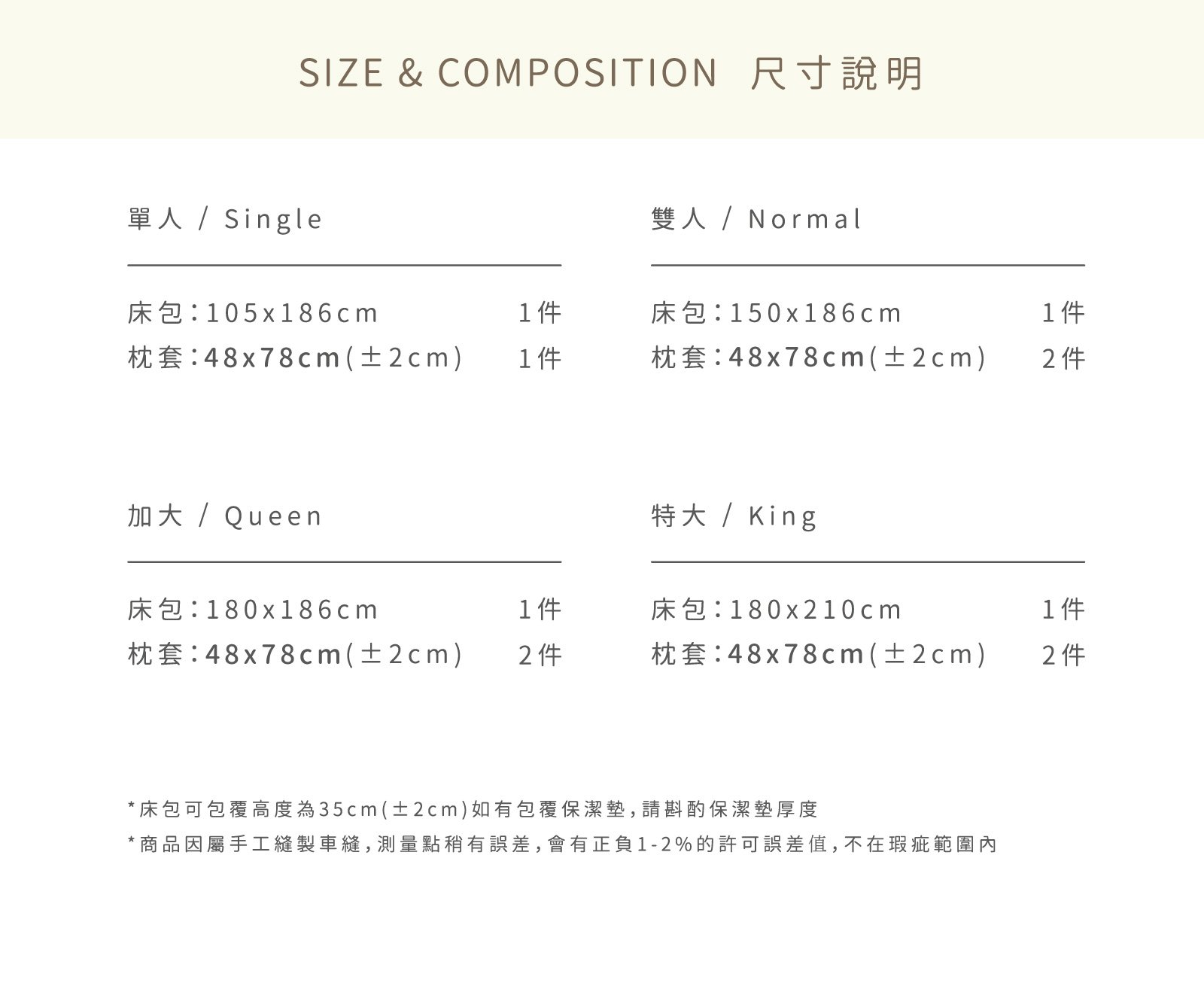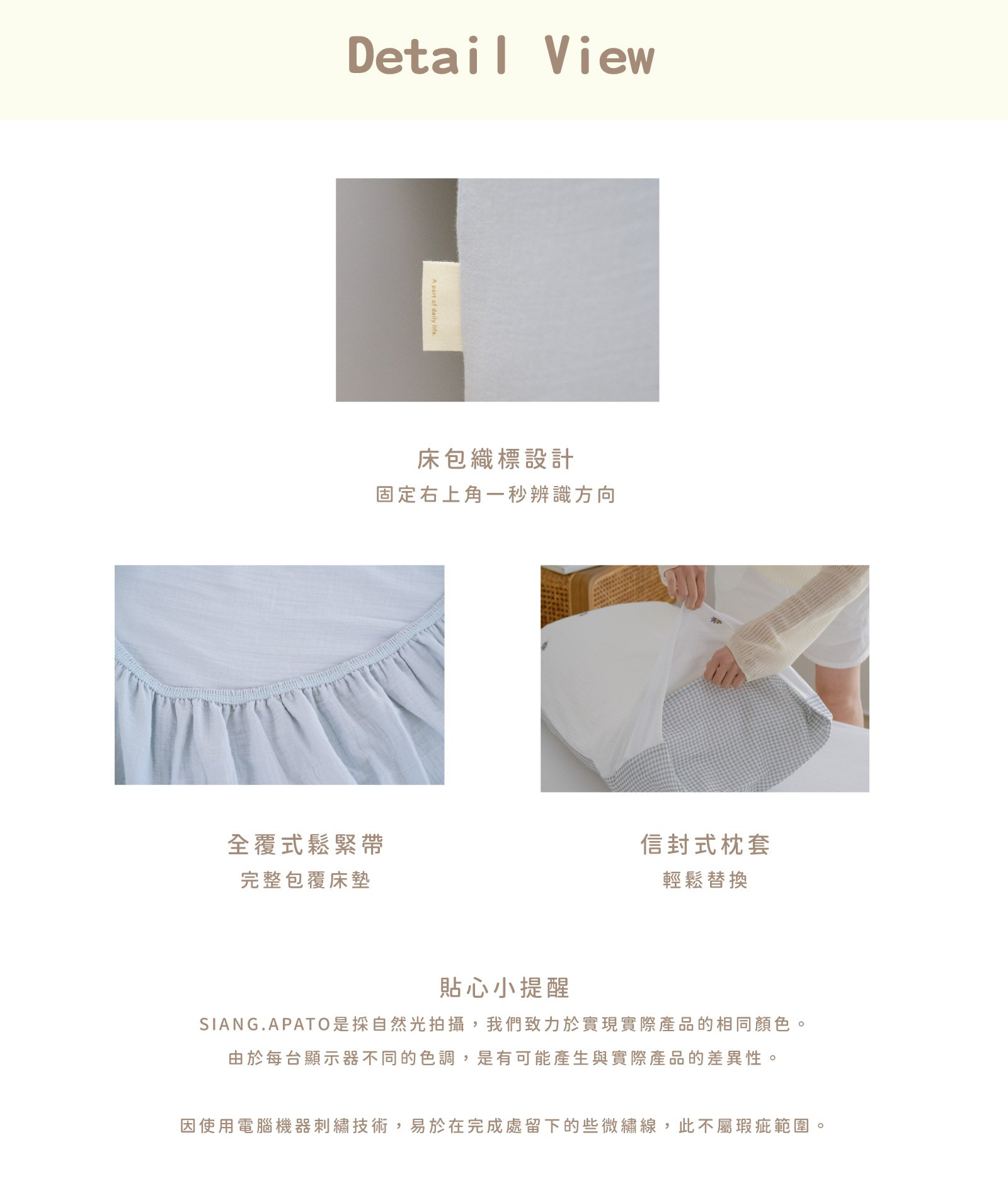 Ocean - 二重紗 / 雙層紗床包組 ( 格紋床包 + 格紋枕套 ) NT$3,760 NT$ 1,880 可國外配送 可國外配送 「隨心所欲的清新洋藍。」 ◆ 100% Cotton 長絨綿花製成,細緻耐用 ◆ 二重紗/雙層紗材質,蓬鬆透氣、貼身柔軟 ◆ Made in Taiwan 台灣製造,品質安心 NT$3,760 NT$ 1,880 #二重紗(雙層紗)#床包組#單人床包#雙人床包#雙人加大床包#雙人特大床包 尺寸 單人雙人加大特大 床包尺寸 寬 長 高 公分 床包鋪棉 需要 不需要 被套尺寸 寬 長 公分 被套鋪棉 需要 不需要 價格試算 數量 加入購物車 立即購買 優惠活動 消費滿 990元 即可用優惠價格加購商品 台中購物節合作5倍店家|官網及北屯門市限定! Line詢問 商品細節 尺寸指南 洗滌方式 商品評價(0)