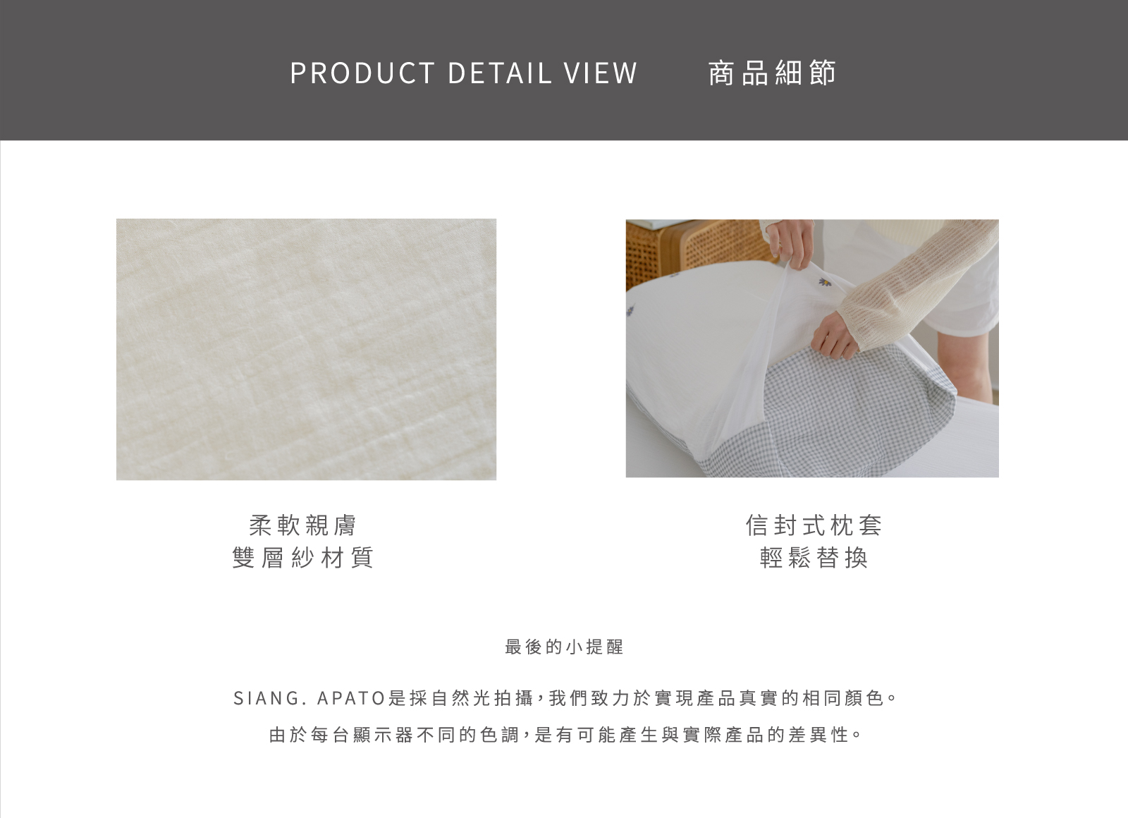 繫心米 - 二重紗 / 雙層紗素色枕套 / 2入組 NT$1,398 NT$ 699 可國外配送 可國外配送 「此刻餘生,繫心相待。」 ◆ 100% Cotton 長絨綿花製成,細緻耐用 ◆ 二重紗/雙層紗材質,蓬鬆透氣、貼身柔軟 ◆ Made in Taiwan 台灣製造,品質安心 NT$1,398 NT$ 699 #二重紗(雙層紗)#枕套#素色 床包尺寸 寬 長 高 公分 床包鋪棉 需要 不需要 被套尺寸 寬 長 公分 被套鋪棉 需要 不需要 價格試算 數量 加入購物車 立即購買 優惠活動 消費滿 990元 即可用優惠價格加購商品 台中購物節合作5倍店家|官網及北屯門市限定! Line詢問 商品細節 尺寸指南 洗滌方式 商品評價(0)
