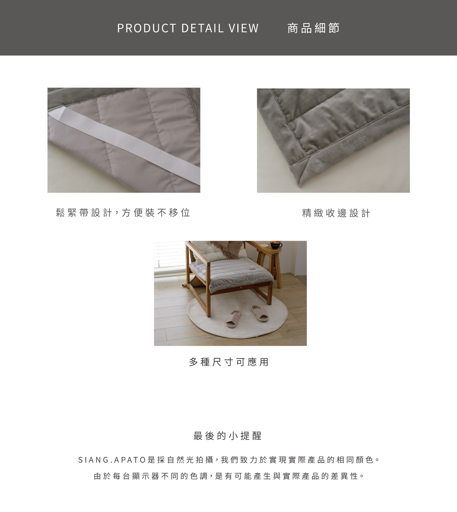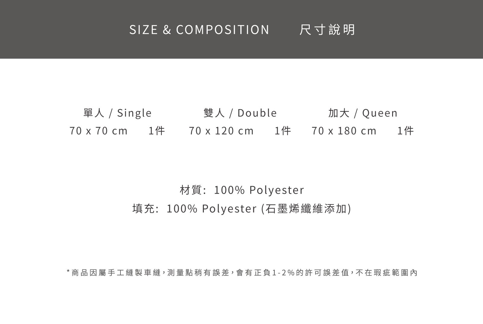 熊暖沙發墊 - 冬季暖墊 NT$1,560 NT$ 780 不可超取 可國外配送 不可超取 可國外配送 「不用電熱毯也能暖呼呼。」 ◆ 水晶絨材質表面,柔軟保暖 ◆ 填充添加石墨烯粒子,維持恆溫效果 ◆ 可當地墊、遊戲墊使用,功能多元 NT$1,560 NT$ 780 #冬季#暖墊 尺寸 單人 70x70cm雙人 70x120cm三人 70x180cm 床包尺寸 寬 長 高 公分 床包鋪棉 需要 不需要 被套尺寸 寬 長 公分 被套鋪棉 需要 不需要 價格試算 數量 加入購物車 立即購買 優惠活動 消費滿 990元 即可用優惠價格加購商品 台中購物節合作5倍店家|官網及北屯門市限定! Line詢問 商品細節 尺寸指南 洗滌方式 商品評價(2)