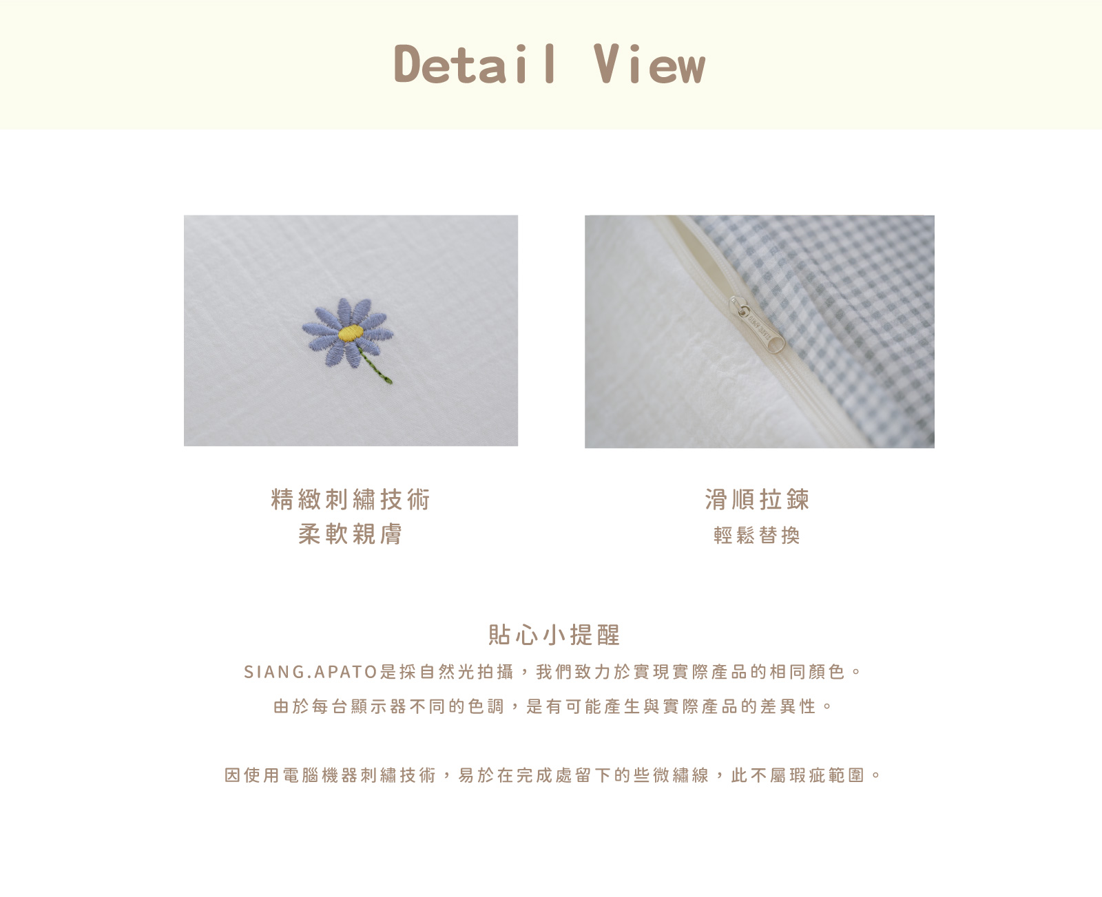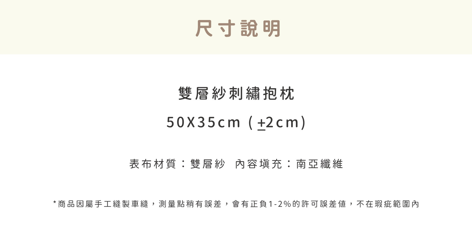 二重紗 / 雙層紗刺繡抱枕 NT$1,598 NT$ 799 不可超取 可國外配送 不可超取 可國外配送 「家裡每個角落都想放一顆。」 ◆ 100% Cotton 長絨綿花製成,細緻耐用 ◆ 二重紗/雙層紗材質,蓬鬆透氣、貼身柔軟 ◆ Made in Taiwan 台灣製造,品質安心 ※本商品尺寸為35 x 50 cm,含枕芯 NT$1,598 NT$ 799 #水洗棉#居家小物#刺繡 款式 花漾刺繡小富士刺繡森語刺繡繫心刺繡 床包尺寸 寬 長 高 公分 床包鋪棉 需要 不需要 被套尺寸 寬 長 公分 被套鋪棉 需要 不需要 價格試算 數量 加入購物車 立即購買 優惠活動 冬日禮遇季|聖誕交換禮物9折 消費滿 990元 即可用優惠價格加購商品 台中購物節合作5倍店家|官網及北屯門市限定! Line詢問 商品細節 尺寸指南 洗滌方式 商品評價(1)