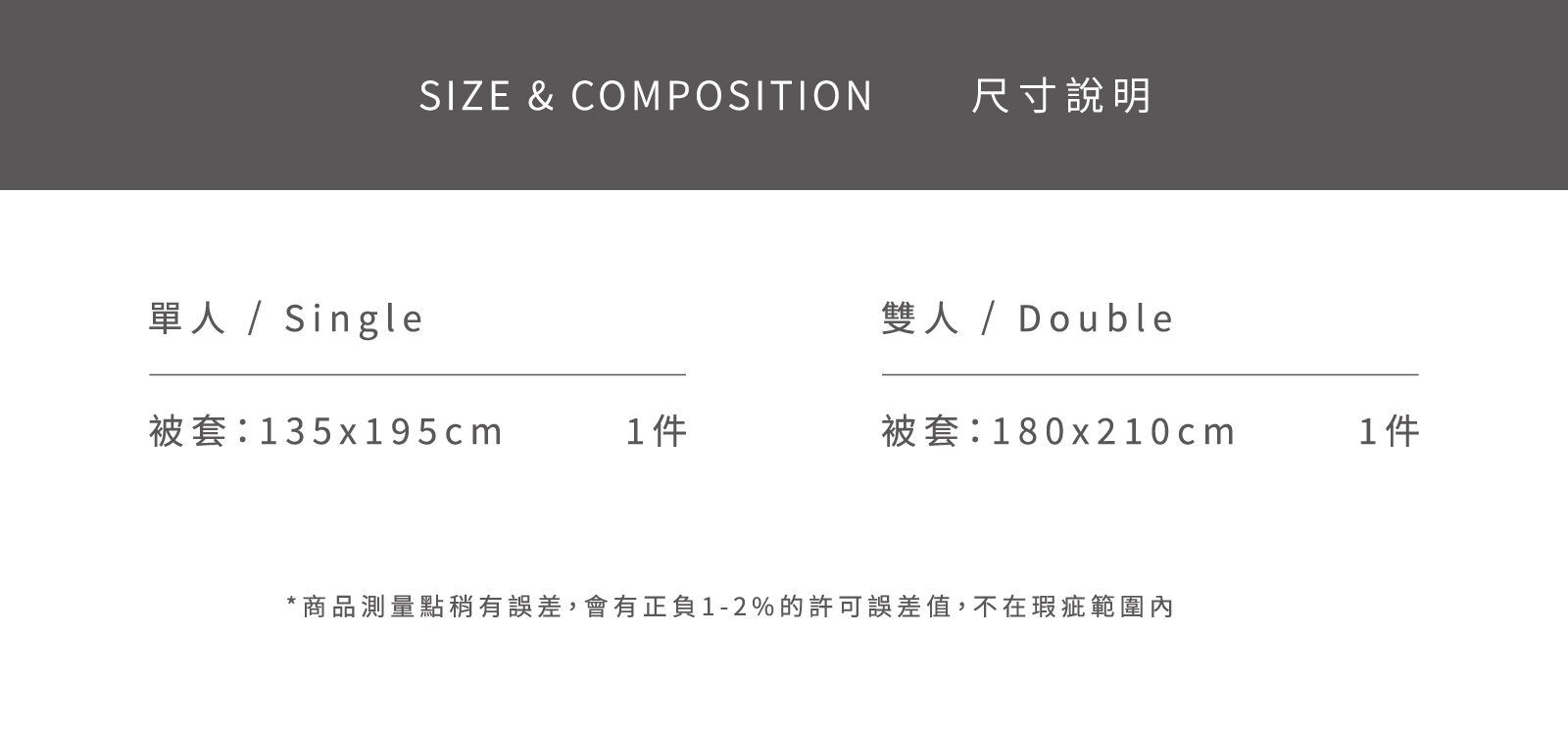 Hallie - 天絲被套 NT$3,560 NT$ 1,780 可國外配送 可國外配送 「想遠離塵囂的時候,就獨自漂浮。」 ◆ 正廠授權100% Tencel 60支天絲™ ,吸濕透氣 ◆ 高品質萊賽爾LF纖維,觸感細緻滑順 ◆ Made in Taiwan 台灣製造,品質安心 NT$3,560 NT$ 1,780 #天絲#棉被#被套 尺寸 單人雙人 規格 薄被套鋪棉兩用被套 床包尺寸 寬 長 高 公分 床包鋪棉 需要 不需要 被套尺寸 寬 長 公分 被套鋪棉 需要 不需要 價格試算 數量 加入購物車 立即購買 優惠活動 消費滿 990元 即可用優惠價格加購商品 翔仔居家感恩回饋全館滿額禮 Line詢問 商品細節 尺寸指南 洗滌方式 商品評價(11)